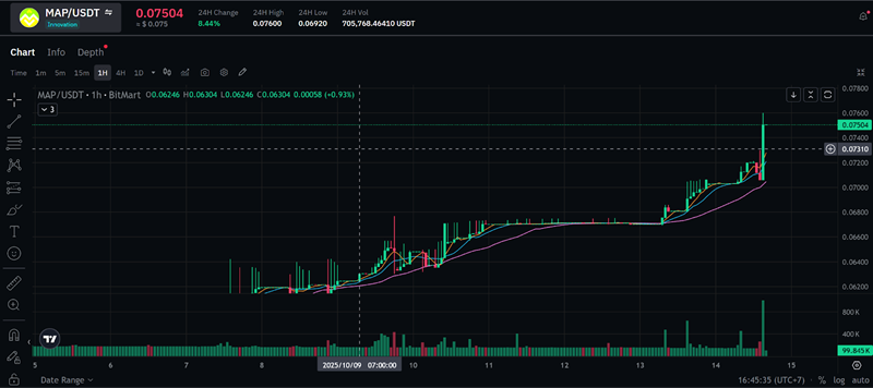 Over the past 24 hours, MAP price has been fluctuating steadily around 0.078 – 0.079 USDT, with trading volume remaining above 700,000 USDT, indicating that demand remains very strong. Technical signals are all supporting the uptrend – RSI remains above 60, MA20 crosses MA50, a pattern that often appears before subsequent price increases.